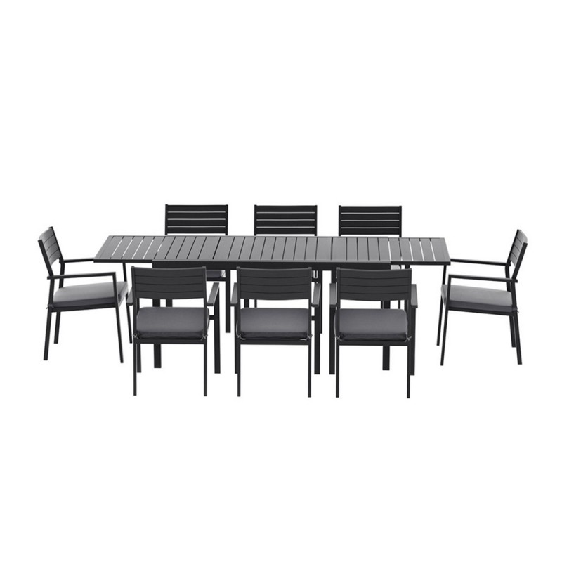 Embrace the warmth of summer with the Gardeon 9-piece Outdoor Dining Set, a perfect blend of style and functionality. Crafted from a durable powder-coated aluminium frame, this versatile set is ideal for both outdoor and indoor use, withstanding various weather conditions. The extendable table accommodates up to twelve guests, making it perfect for gatherings. Each chair supports up to 150kg and features inclined backrests, handrails, and plush 5cm foam cushions with removable, washable covers for ultimate comfort. Easy assembly and slatted surfaces for drainage make this set a hassle-free, elegant addition to any space.