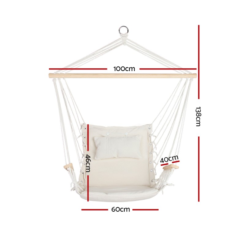 Transform your backyard into a serene retreat with the Gardeon Hammock Chair Hanging with Armrest in Cream. Crafted with a solid timber rail and quality polyester cotton, this hammock chair promises long-lasting comfort and durability. Its robust strings support up to 120kg, making it an ideal spot for anyone to unwind. Featuring a soft pillow and thick foam padded seat, it's perfect for lounging with a book or enjoying music. The wooden armrests enhance relaxation, and its easy installation makes it versatile for indoor or outdoor use, whether attached to trees, ceilings, or pergola beams. Note: Hand wash the pillow gently to preserve the filling.