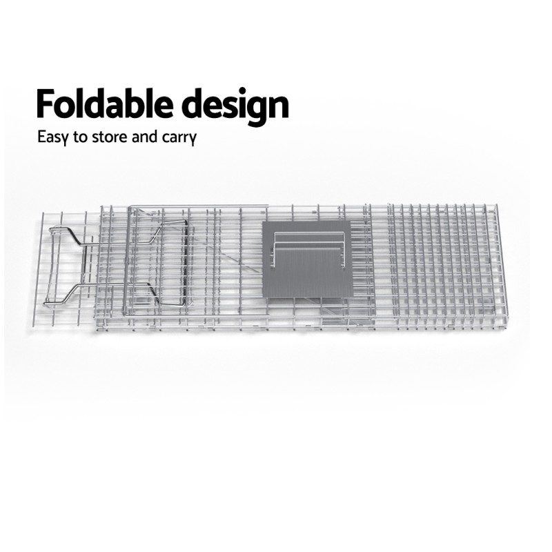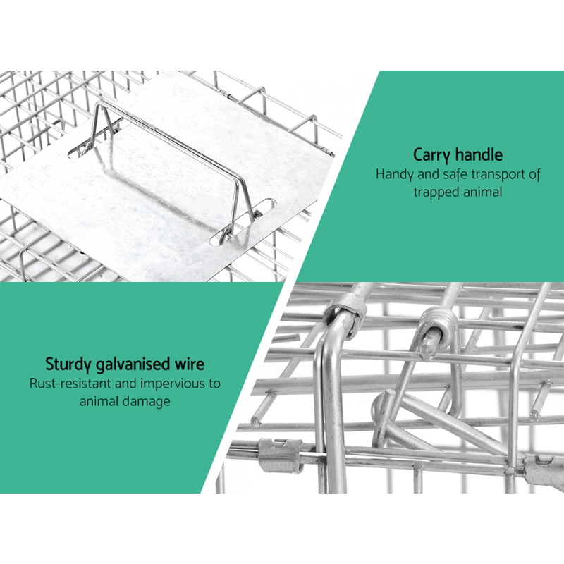 Introducing the Gardeon Humane Animal Trap Cage, designed for those seeking a compassionate solution to unwanted animal intrusions. This eco-friendly trap is crafted from rust-resistant galvanised iron and features a spring-loaded, one-way door with an automatic locking system to ensure safe capture. With easy setup, a sturdy handle for safe transport, and a collapsible design for convenient storage, this trap is perfect for humane animal removal. Always cheque local regulations before use.