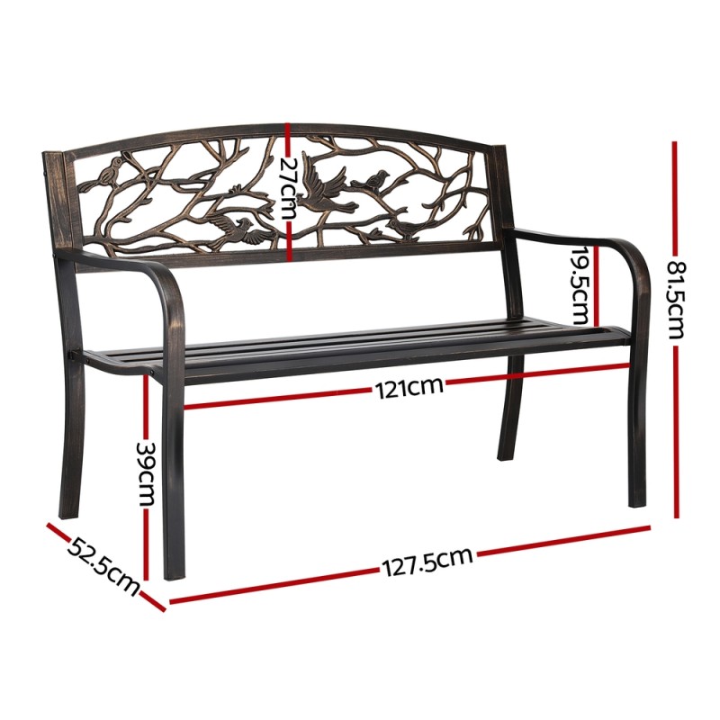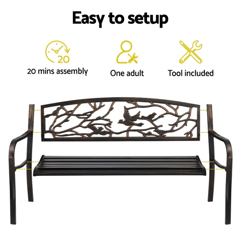 Enhance your outdoor or entryway space with the Gardeon Outdoor Bench Seat. This elegant 3-seater bench boasts a robust steel frame with a rust-resistant powder-coated finish, ensuring long-term durability. Its charming vintage bird and branch pattern adds a decorative flair, while the slatted design ensures comfort. Perfect for patios, gardens, or porches, it supports up to 260kg, making it ideal for relaxing or as a stylish decorative piece. Easy to assemble without tools and suitable for both indoor and outdoor use, this bench seamlessly combines functionality with aesthetic appeal.