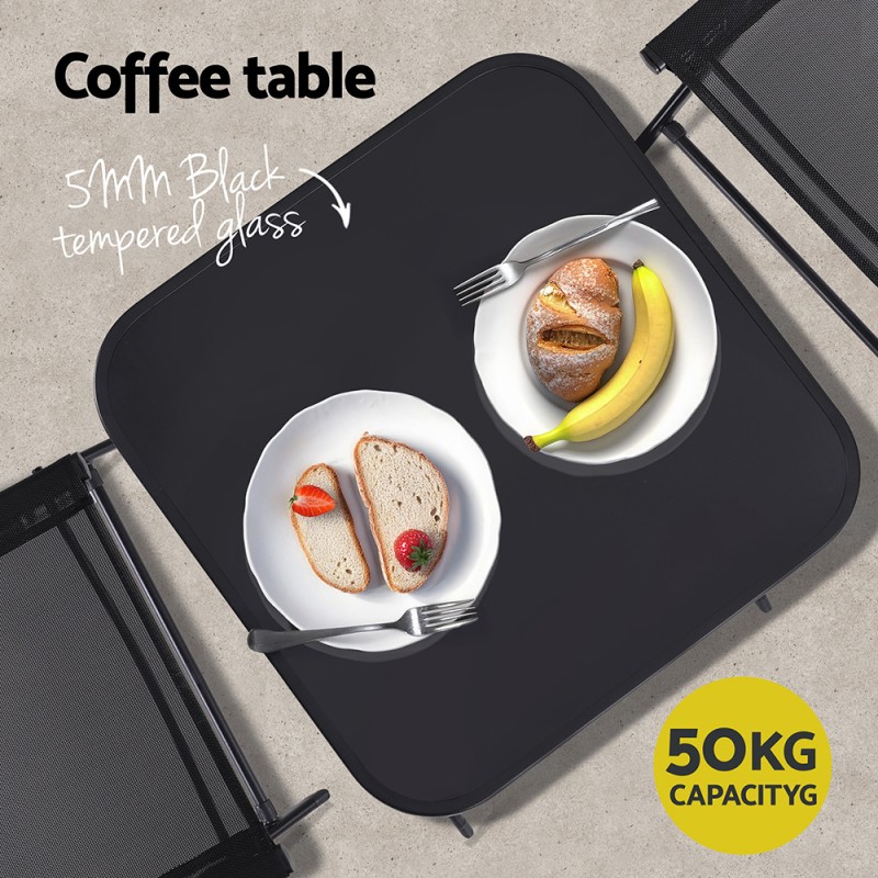 Transform your outdoor space with the Gardeon Outdoor Bistro Set—an effortlessly chic 3-piece ensemble featuring two foldable chairs and a folding table. Designed for versatility, the lightweight set is easy to move, store, or take on the go, making it perfect for patios, balconies, or picnics. Durable powder-coated steel frames and breathable textilene fabric ensure lasting comfort and weather resistance. The sleek tempered glass tabletop offers a convenient spot for drinks or snacks—ideal for relaxing in style, indoors or out.