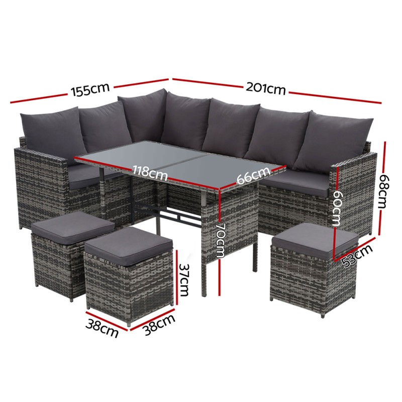 Transform your garden into a haven of relaxation and entertainment with the Gardeon Outdoor Dining Set. This 9-seater ensemble, crafted with a durable powder-coated steel frame and elegant PE wicker, is perfect for gatherings or tranquil afternoons. Featuring UV and weather-resistant materials, plush water-resistant cushions, and a tempered glass table, it promises enduring style and comfort. With flexible arrangements and easy assembly, it's a must-have for any outdoor space. Includes a protective cover for lasting enjoyment.
