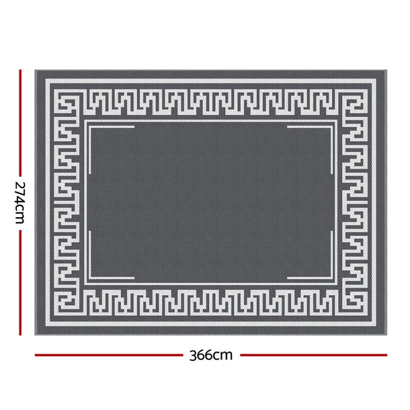 Elevate your outdoor ambience with the Gardeon Outdoor Rug, a versatile masterpiece that promises both style and functionality. Measuring an impressive 274x366cm, this large, reversible area mat features a chic Greek Key design on both sides, offering an instant refresh to patios, decks, or any outdoor setting. Made from premium polypropylene with a UV and heat-resistant coating, it withstands fading, water, and wear while remaining delightfully soft underfoot. Lightweight and portable, it's perfect for gardens, beaches, RVs, and more. Easy to clean with just a hose, this rug is your ideal companion for endless outdoor adventures.