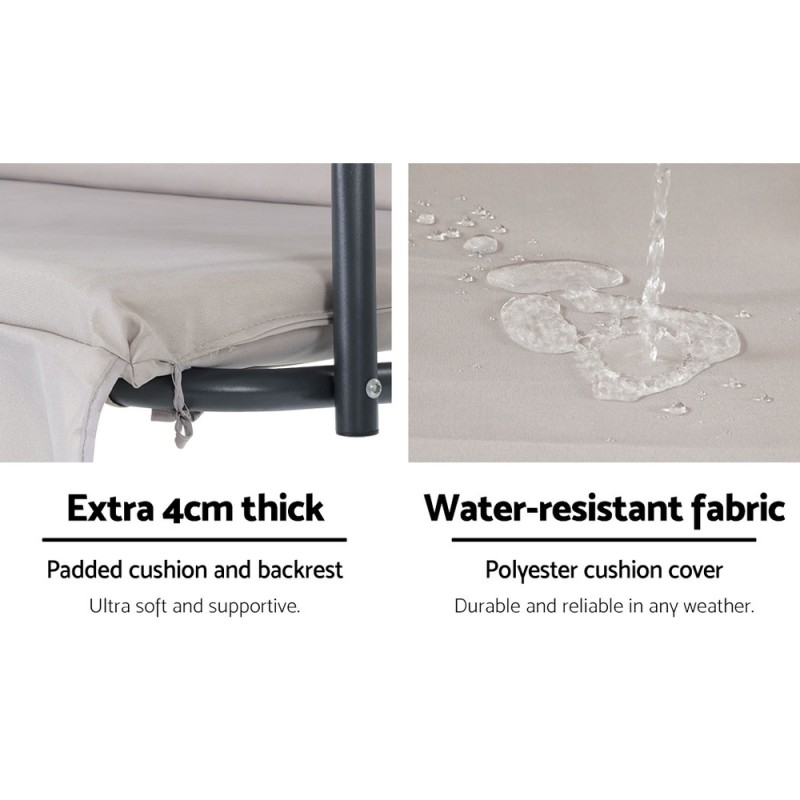 Experience swinging comfort with the Gardeon Outdoor Swing Chair. Designed for three, it features a powder-coated steel frame and plush textilene seat. Its water-resistant, UV-protected canopy can adjust or detach for sunbathing. With removable, easy-clean cushions and upgraded springs for smooth motion, it's perfect for any weather. Ideal for garden, patio, or poolside, this swing chair ensures leisure time is always inviting. Simple assembly makes relaxation effortless. Get yours today!