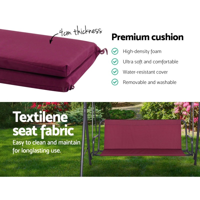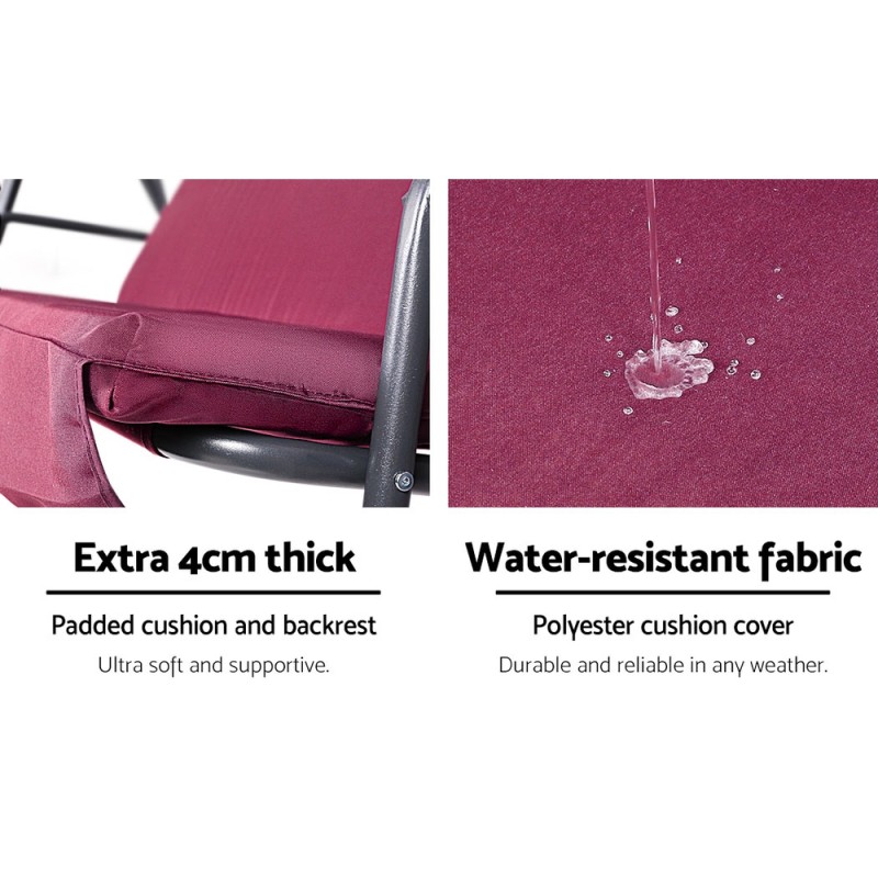 Experience ultimate relaxation with the Gardeon Outdoor Swing Chair. This elegant 3-seater, in a striking wine red, is perfect for socializing or unwinding. Featuring a water-resistant, UV-protected adjustable canopy, and a durable powder-coated steel frame, it promises comfort in any weather. The removable, easy-to-clean cushions and upgraded springs ensure a smooth swing. Ideal for gardens, patios, or indoors, it assembles easily for your leisure.