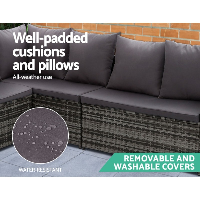 Transform your outdoor space with the Gardeon Outdoor Furniture Dining Setting Sofa Set. This 9-seater ensemble is perfect for social gatherings or tranquil relaxation. Crafted from sturdy powder-coated steel and high-quality PE wicker, it's both UV and weather-resistant. The set includes a tempered glass table and plush, water-resistant cushions for ultimate comfort. Enjoy versatile seating arrangements and easy assembly with this stylish, durable furniture set.