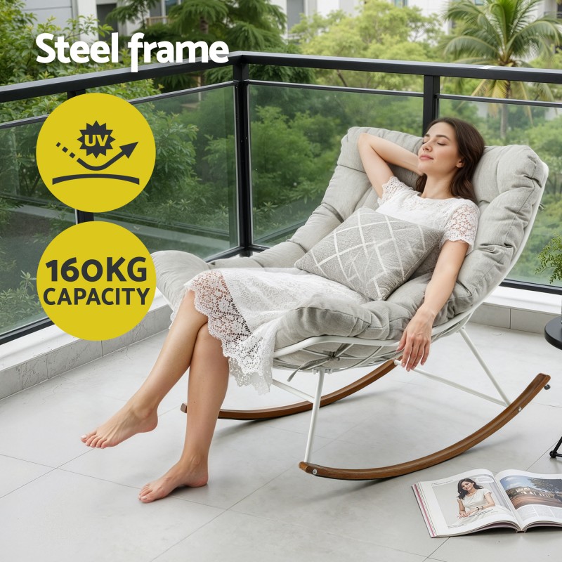 Relax in the Gardeon Papasan Rocking Chair — a plush indoor or outdoor recliner designed for comfort and style. The sturdy steel frame with protective e-coating resists rust water and UV damage while the thick polyester cushion offers stain and fade resistance. A curved wood grain sled base delivers gentle 30° rocking with floor protectors to reduce noise and scuffs. Ideal for decks patios sunrooms or living spaces this easy to assemble chair blends durability with pillowy comfort.