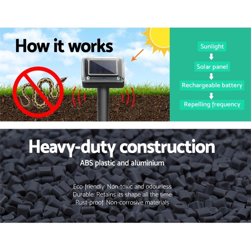 Protect your family and pets with the Gardeon Snake Repeller 20X Ultrasonic Solar Powered set. Designed to reduce snake encounters without harm, these repellers emit sonic pulses and vibrations through the ground. Perfect for gardens, yards, farms, and orchards, they're powered by solar energy and include rechargeable batteries for continuous operation. With a weatherproof, UV-resistant design, these repellers are portable and eco-friendly, offering peace of mind at zero operating cost.