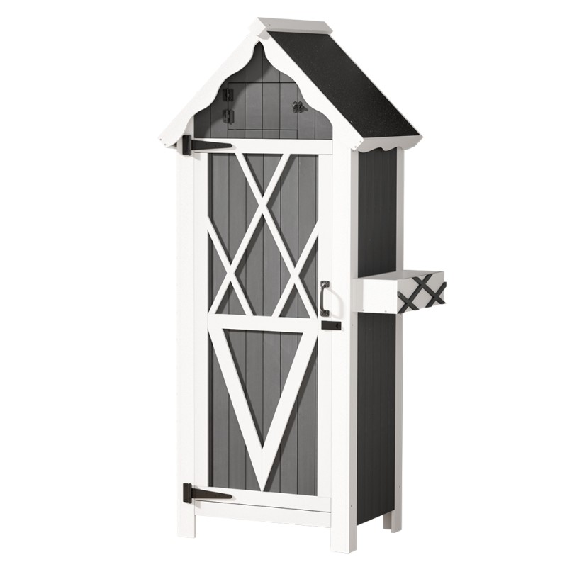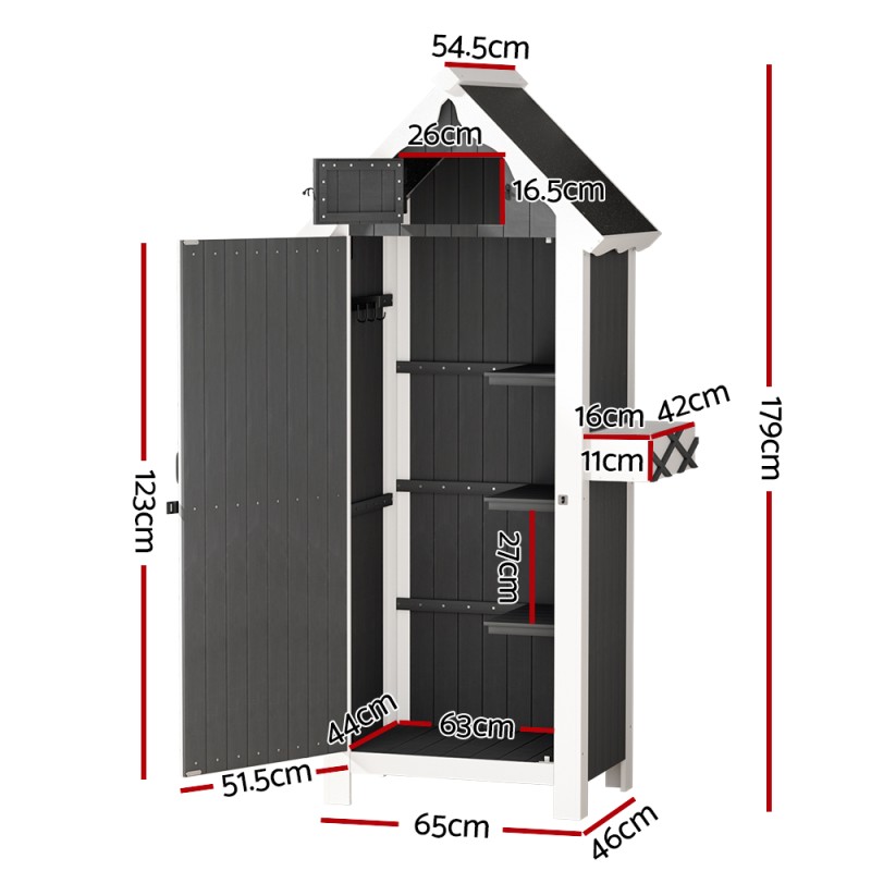 Introducing the Gardeon Wooden Storage Shed, the perfect blend of style and practicality for your outdoor space. Crafted from solid Fir wood, it offers 3-tier shelving, 3 metal hangers, and a charming cuckoo-style upper compartment, all safeguarded by a lockable, magnetic latched door. Its weather-resistant build and water-resistant asphalt roof ensure durability. Ideal for indoor or outdoor use, this shed promises easy assembly and a rustic appeal, complete with a 1-year warranty.