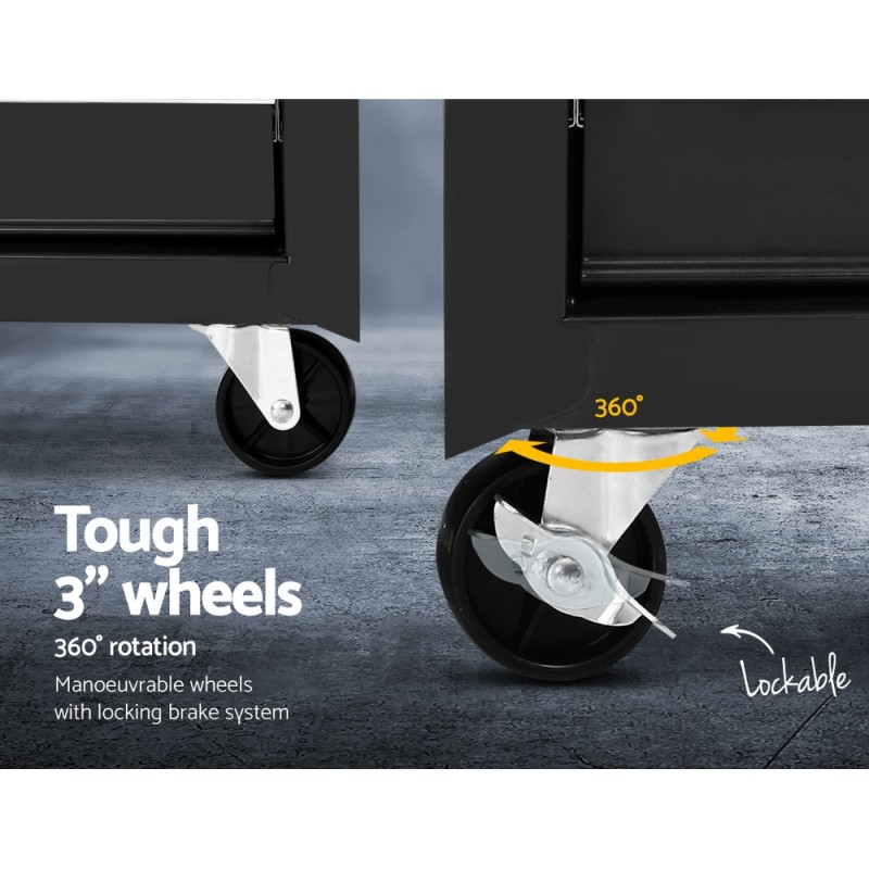 The Giantz 16 Drawer Tool Box Cabinet Chest Trolley is the ultimate solution for your workshop storage needs. Built from durable steel with a sleek black powder-coated finish, this robust tool trolley offers 16 fully lockable drawers, ensuring your tools are organised and secure. The smooth ball-bearing slides and non-slip liners provide easy access and protection for your tools. Its flexible design allows the chest and trolley to be separated, while the 360-degree omnidirectional castors with lockable front wheels ensure smooth manoeuvrability and stable positioning. Perfect for organising and safeguarding your valuable tools, this trolley is a must-have for professionals and DIY enthusiasts alike.