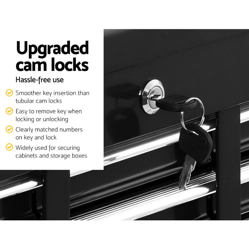 The Giantz 17 Drawer Tool Box Cabinet Chest Trolley is the ultimate storage solution for any workshop. Constructed from durable steel with a sleek powder-coated black finish, this robust tool trolley ensures your tools are organised and protected. Featuring 17 fully lockable drawers with ball-bearing slides, it offers easy access and a secure lock system with four keys. The non-slip, scratch-proof liners provide added protection for your tools. Designed for flexibility, the chest and trolley can be separated, while the omnidirectional castors with lockable front wheels guarantee smooth manoeuvrability and stable positioning. Perfectly designed to accommodate tools of all shapes, this tool box is as functional as it is stylish.