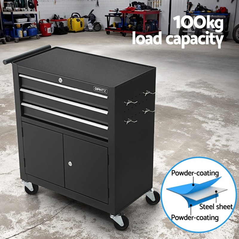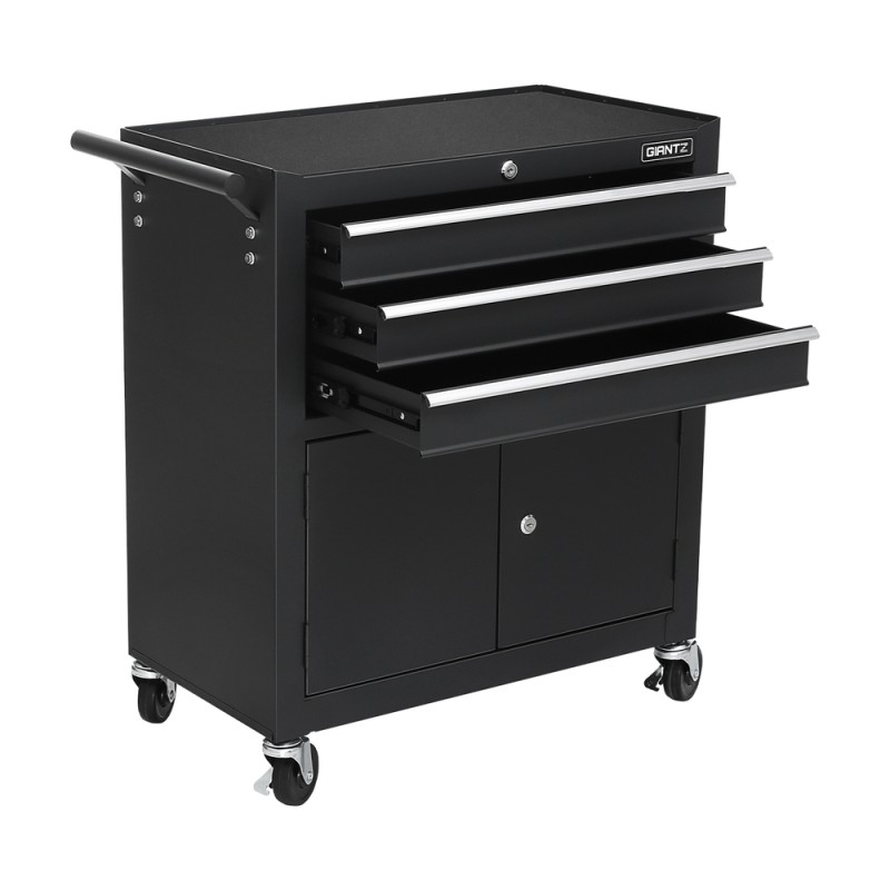 Keep your workspace organised and efficient with the Giantz 3 Drawer Tool Box Chest Cabinet. Built from thick, powder-coated steel, this robust storage solution features three smooth-gliding drawers and a double-door cabinet, secured by upgraded cam locks. Non-slip liners and a side pegboard keep your tools safe and accessible, while omnidirectional castors with lockable front wheels provide easy mobility and stability. Perfect for garages and workshops, it delivers ample storage and lasting durability.