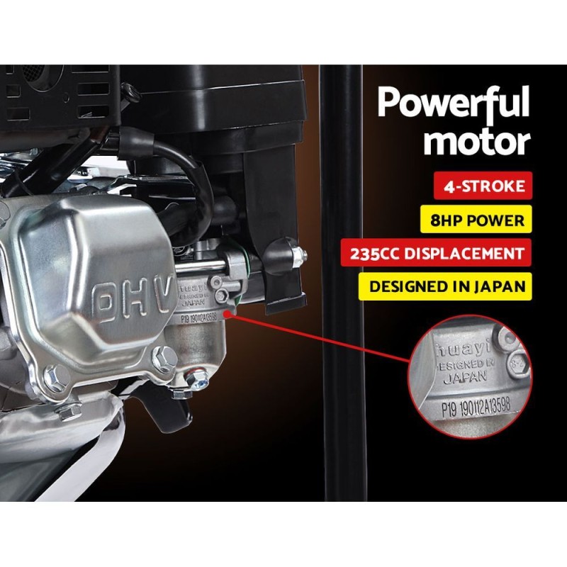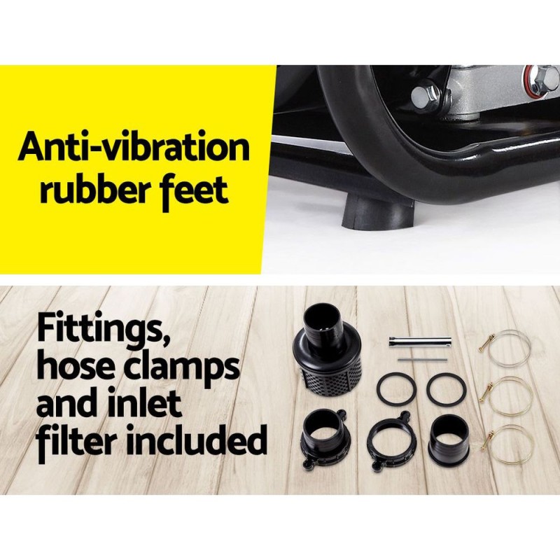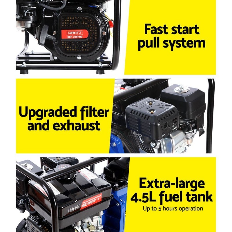Experience unparalleled performance with the Giantz Petrol Water Pump 3" High Flow Transfer Fire Fighting Irrigation system. This powerhouse is perfect for a range of water pumping tasks, from heavy-duty cleaning to garden irrigation and emergency flood management. Boasting a robust 8hp, 235cc 4-stroke engine, it delivers an impressive flow rate of 60,000L/h, effortlessly transferring water up to four storeys high. The durable anti-corrosive tubular steel frame, ceramic and carbon seals, and an extra-large 4.5L fuel tank ensure long-lasting reliability and up to five hours of operation per fill. Complying with Euro 5 emissions standards, itβs an environmentally conscious choice.