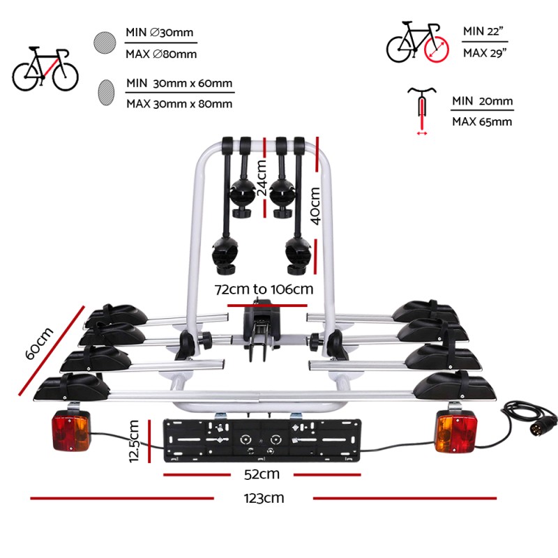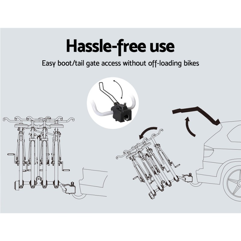 Introducing the Giantz 4 Bicycle Bike Carrier Rack, the ultimate solution for transporting up to 4 bikes with ease and security. Crafted from robust steel and aircraft-grade aluminium, this carrier offers a durable yet lightweight design. With a total weight capacity of 60kg, it ensures your bikes are securely mounted with adjustable wheel stoppers, tie-down straps, and bar locks. The innovative tilting feature provides trunk access without the need to unload your bikes. Equipped with a standard 7-pin power plug for E-mark tail lights, this carrier prioritises safety and convenience. Weighing just 15.30kg, it's a reliable partner for your cycling adventures.
