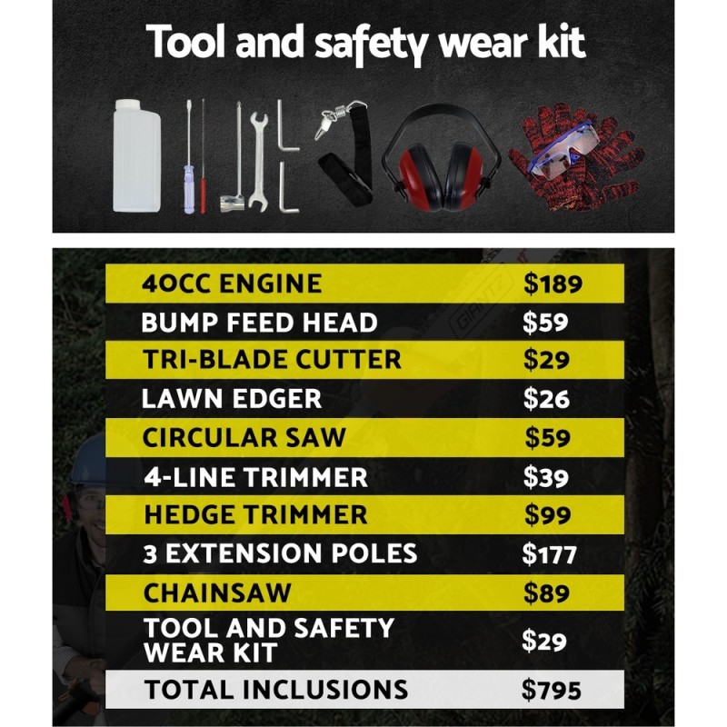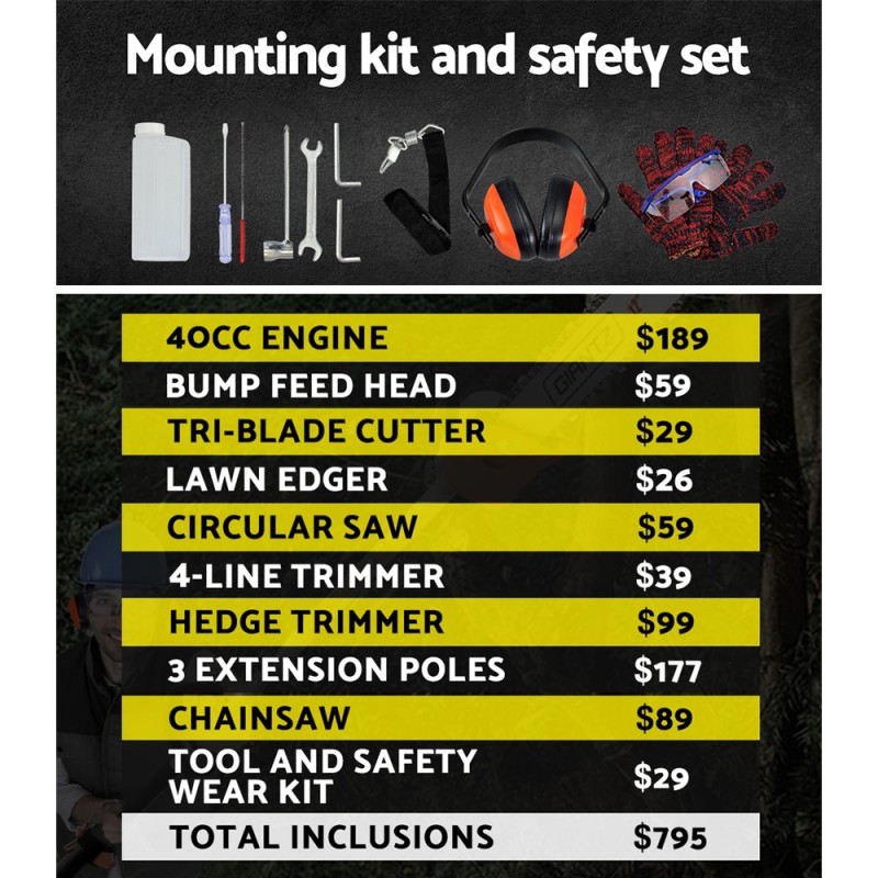 Elevate your gardening game with the GIANTZ 40CC Pole Chainsaw Hedge Trimmer Brush Cutter Whipper Saw 4-Stroke 9-in-1. Engineered for serious cutting, this Pro-series tool boasts a robust 40cc, 4-stroke full crank engine for effortless starting and operation. Its lightweight design and comfortable D-handle promise ease of use, while the quick-connect coupling allows seamless attachment changes. Reach high branches with three extra thick alloy extension poles, ensuring consistent reliability and sharpness. Enjoy the precision of fine quality construction and cutting-edge technology, tackling every garden challenge with ease.