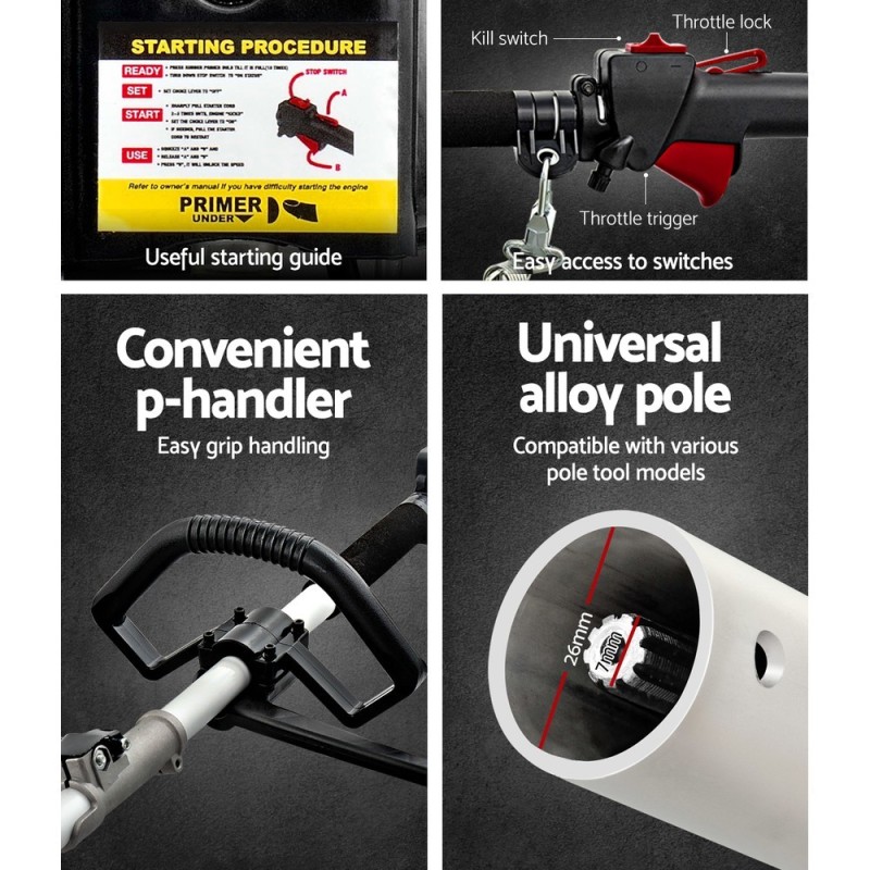 The GIANTZ 40CC Pole Chainsaw Hedge Trimmer Brush Cutter Whipper Saw 4-Stroke 7-in-1 is the ultimate tool for serious gardening enthusiasts. Powered by a robust 40cc, 4-stroke full crank engine, it ensures smooth starts and operation, tackling every cutting task effortlessly. Its lightweight design, comfortable D-handle, and quick-connect coupling make switching between the seven included attachments a breeze. With three alloy extension poles, reach even the highest branches with ease. Built with fine quality construction and cutting-edge technology, this chainsaw promises reliability, durability, and consistent sharpness.
