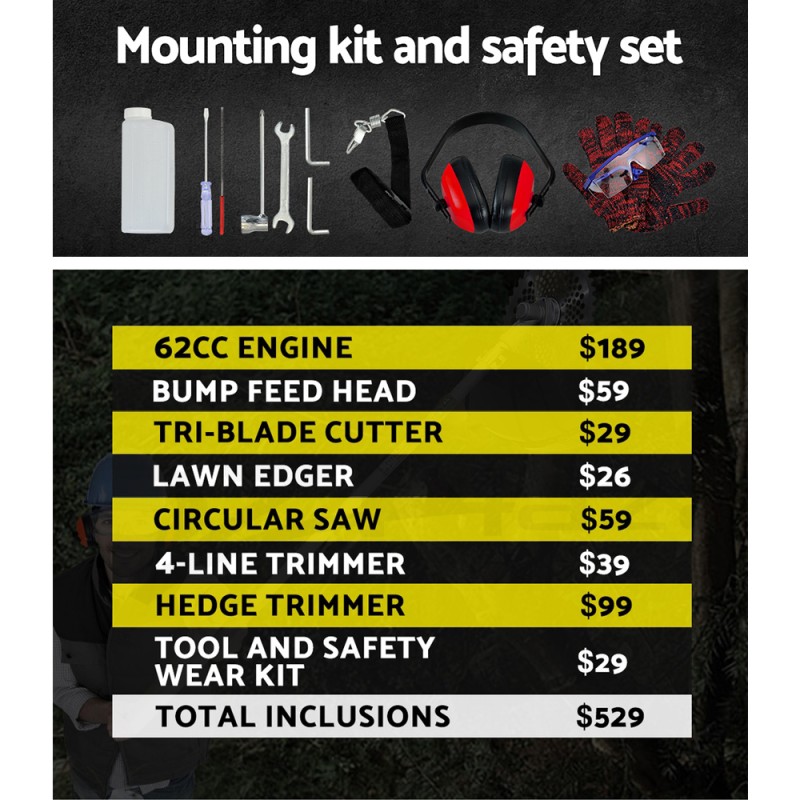 Unleash the ultimate in gardening prowess with the Giantz 62CC Pole Circular Saw Petrol Brush Cutter Whipper Snipper 7-in-1. This Pro-series powerhouse combines seven versatile gardening tools with a robust 62cc 2-stroke engine, making light work of cutting, trimming, and sculpting tasks. Designed for efficiency and comfort, it features a super responsive motor, anti-vibration mechanism, and an easy-start system. The commercial-grade alloy shafts and dual ball-bearing couplings ensure smooth operation, while the comprehensive accessory kit, including gloves, ear muffs, and a mini tool kit, offers everything you need for safe and precise gardening.