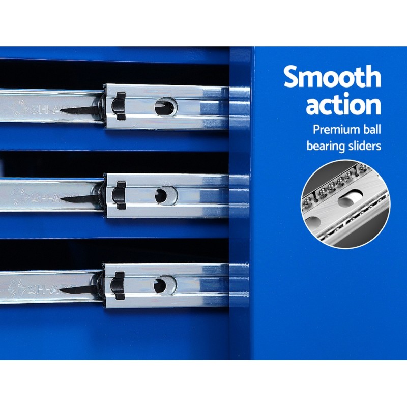 The Giantz 7 Drawer Tool Box Cabinet Chest Trolley in a striking blue finish is the ultimate solution for any workshop in need of organisation and efficiency. Made from durable, powder-coated steel, this robust tool trolley boasts seven fully lockable drawers, each equipped with smooth ball-bearing slides for effortless access. The drawers come with non-slip, scratch-proof liners that keep your tools secure and protected. Easily manoeuvrable with its 360-degree omnidirectional castors and lockable front wheels, this trolley ensures stability and convenience. With a 100kg capacity, it accommodates tools of all shapes and sizes. Plus, it comes with a 1-year warranty for your peace of mind.