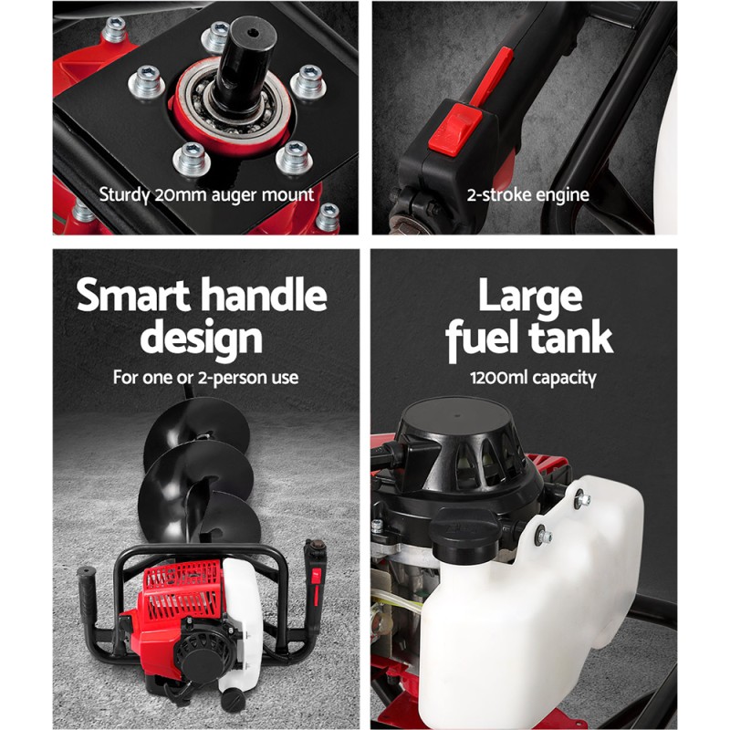 Say goodbye to backbreaking manual digging with the GIANTZ 92CC Post Hole Digger. Powered by a robust 92cc 3kW 2-stroke petrol engine, it delivers up to 9000rpm for precision and ease. Its advanced vertical gearbox design ensures efficiency and reliability. Securely connect reinforced augers and extensions to break hard ground effortlessly, reaching depths of 1.8m. Perfect for fence posts, decking, and more, it features easy startup, quality rubber grips, and a sturdy steel construction. Comes with a 1-year warranty.