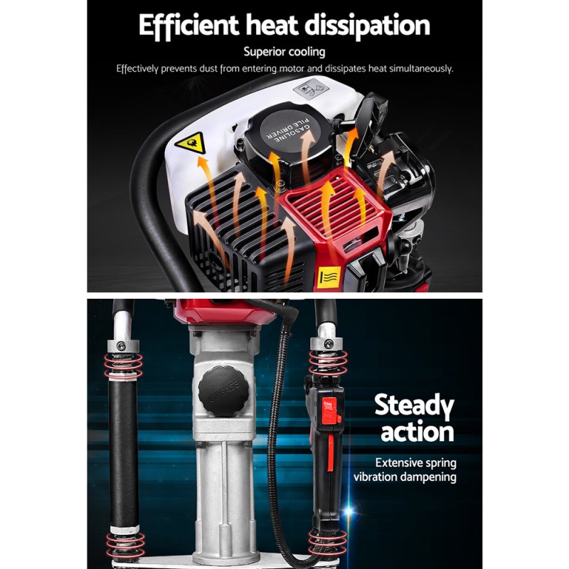 The Giantz Petrol Post Driver is engineered for power and precision, making tough jobs look easy. With a robust 32.7cc 2-stroke petrol motor, this tool effortlessly drives stakes, pegs, and posts up to 80mm in diameter into the ground. Its hardened hammer pin and high impact frequency ensure rapid completion of tasks with minimal effort. Designed for comfort, it boasts soft rubber grip handles and vibration-absorbing springs. The driver features interlocking controls with a throttle lock, kill switch, and adjuster for seamless operation. Lightweight at only 11kg, it comes with a bonus hard carry case for easy transport.