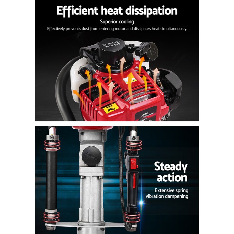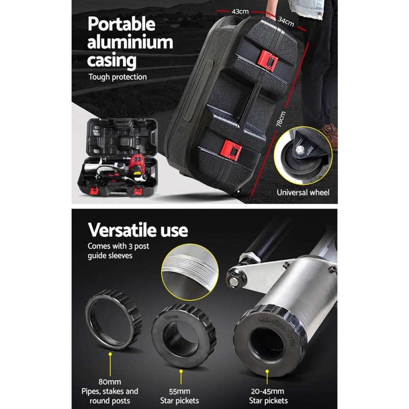 The Giantz Petrol Post Driver is engineered for power and precision, making challenging post-driving tasks a breeze. Boasting a robust 4-stroke 38CC petrol motor, it effortlessly drives stakes, pegs, and posts up to 80mm in diameter into the ground, thanks to its hardened hammering pin and exceptional impact frequency. Designed for ease, it features soft rubber grip handles and vibration-absorbing springs to reduce fatigue, alongside interlocking controls for seamless operation. With a heavy-duty aluminium casing and 2 tonnes of driving power, the Giantz Post Driver is your ultimate tool for tough outdoor projects.