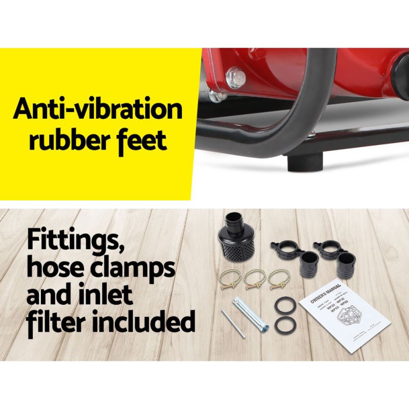 Introducing the Giantz Petrol Water Pump 2" High Flow, designed for optimal performance in firefighting and irrigation. With a robust 210cc 4-stroke engine, it delivers an impressive flow rate of 30,000L/h, capable of transferring water up to four storeys high. The pump's anti-corrosive alloy housing and durable ceramic and carbon seals ensure longevity, while its easy start system and noise-reducing features offer convenience and comfort. Equipped with a 3.6L fuel tank for extended operation, it includes bonus hose fittings and an inlet filter for seamless setup. The Giantz Water Pump is your reliable partner for efficient water transfer.