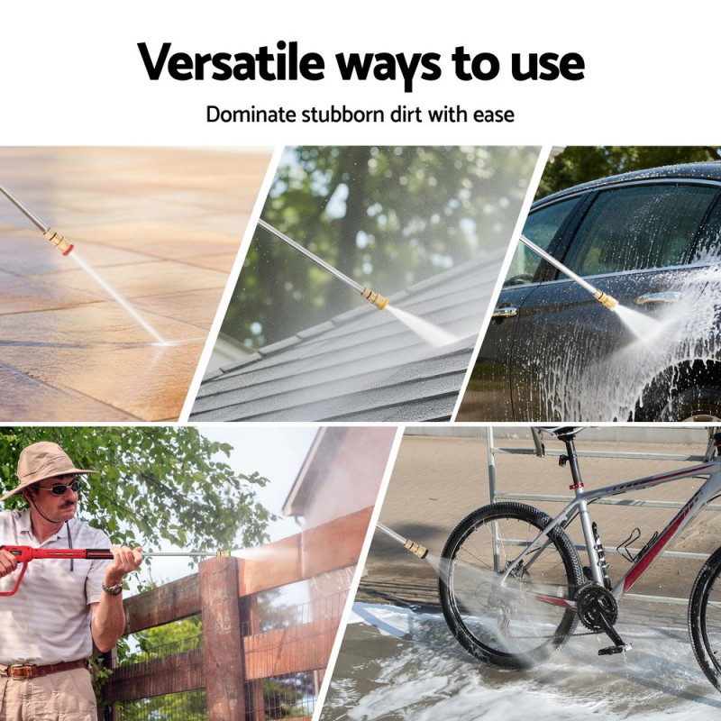 Elevate your cleaning game with the Giantz Pressure Washer Gun Short Trigger. Designed for demanding outdoor tasks, it boasts up to 4000 PSI power and a 3 GPM flow to conquer stubborn dirt on cars, patios, and more. Effortlessly switch between five nozzles for precision cleaning, from a 0° jet to a 65° spray. Made with durable brass, stainless steel, and high-quality plastic, it’s lightweight and easy to handle. The M22-14 inlet and 1/4-inch outlet ensure quick connection to most pressure washers. Transform your washer into a high-performance cleaning tool with the Giantz Pressure Washer Gun.