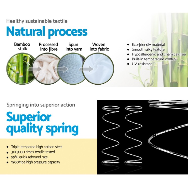 Experience unparalleled sleep health with the Giselle Bedding Alanya Series 34cm Euro Top Mattress. Featuring a luxurious 500gsm bamboo charcoal knitted fabric cover, this king-size mattress enhances blood circulation and reduces stress for a restful night's sleep. Its plush Euro Top padding, high-density foam, and innovative independent coil system offer medium-firm support beloved by Australians. Wake up rejuvenated with this 34cm thick mattress, designed for ultimate comfort and durability. Secure yours today for a guaranteed good morning!