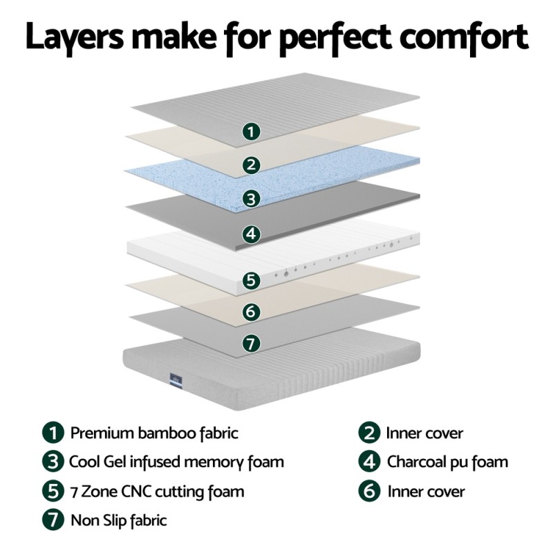 - Foam Material: Cooling gel-infused memory foam, charcoal PU foam, 7 zone CNC cutting foam