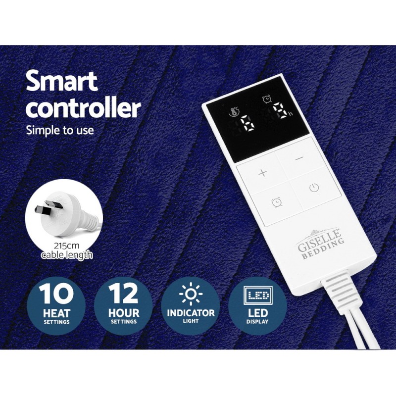 Experience ultimate comfort with the Giselle Bedding Electric Throw Blanket in Navy. This lightweight, super-soft coral fleece throw rug is perfect for snuggling up on the couch or enjoying outdoor gatherings. With up to ten temperature settings, a 12-hour timer, and overheat protection, you can customise your warmth while saving on heating bills. Machine washable and equipped with a detachable LED controller, this throw rug combines convenience and luxury for cosy days and nights.