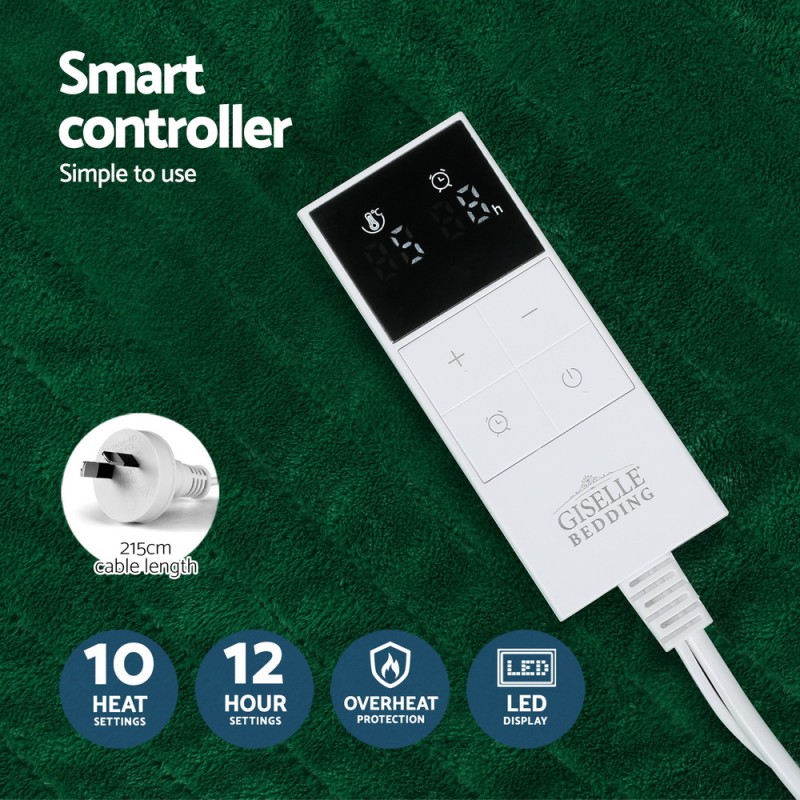 Experience ultimate warmth and comfort with the Giselle Bedding Electric Throw Rug in stylish green. Crafted from premium double-sided flannel and Sherpa fabric, this heated throw offers 10 temperature levels, a 12-hour timer, even heat distribution, and energy-saving performance. The detachable LED controller, overheat protection, and automatic shut-off ensure safe, effortless use. Machine washable and anti-dust mite, it's the perfect cosy addition for your bedroom or living room.