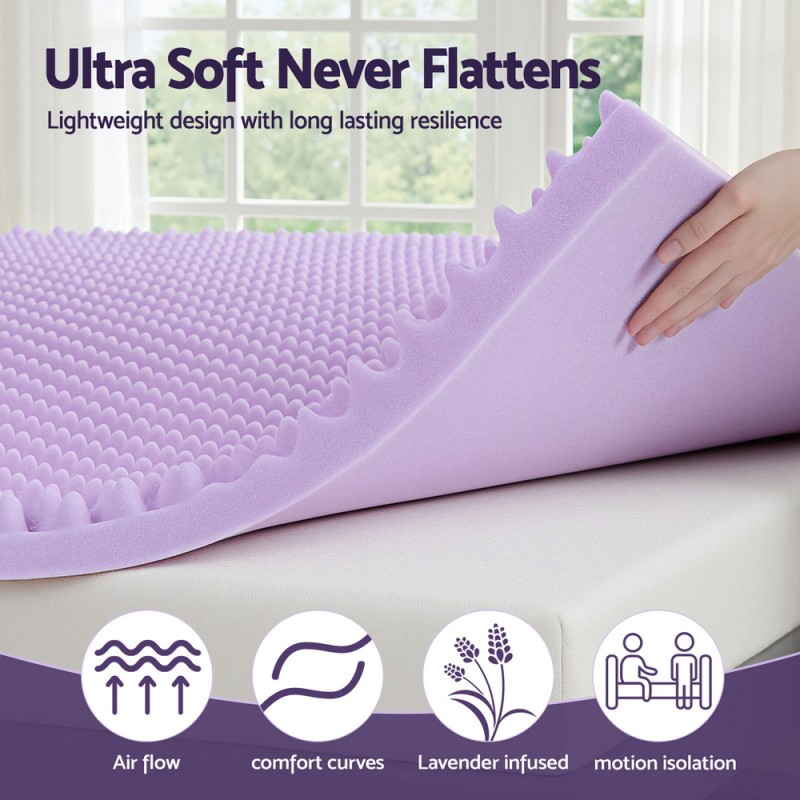 Transform your sleep experience with the Giselle 5cm Memory Foam Mattress Topper, infused with calming lavender. This king-sized topper features a breathable egg crate design that enhances airflow and conforms to your body, promoting deeper relaxation. With over 1000 support points, it evenly distributes weight to relieve pressure from shoulders and hips, while motion isolation ensures undisturbed rest. Perfect for hot sleepers, its cool, breathable comfort helps you unwind after a long day. Lightweight and easy to position, this topper supports spine and joint alignment for a restful night's sleep.