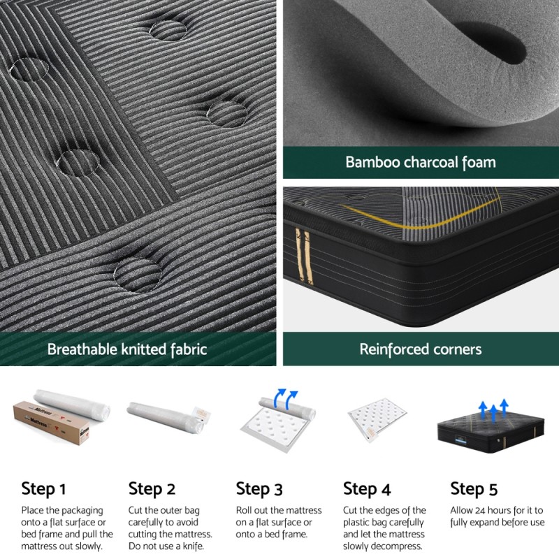 Experience the pinnacle of comfort with the Giselle Bedding Midnight Series Queen Bed Mattress. At 35cm thick, this hybrid mattress elegantly combines a medium-firm Euro Top with bamboo charcoal foam to regulate airflow and moisture. Its independent pocket spring system and high-density foam offer ergonomic support and durability, while breathable knitted fabric ensures optimal temperature control. Reinforced edges prevent sagging, making it ideal for all sleeping positions. Enjoy balanced support, motion isolation, and stability with a mattress designed for ultimate relaxation, backed by a 5-year warranty.