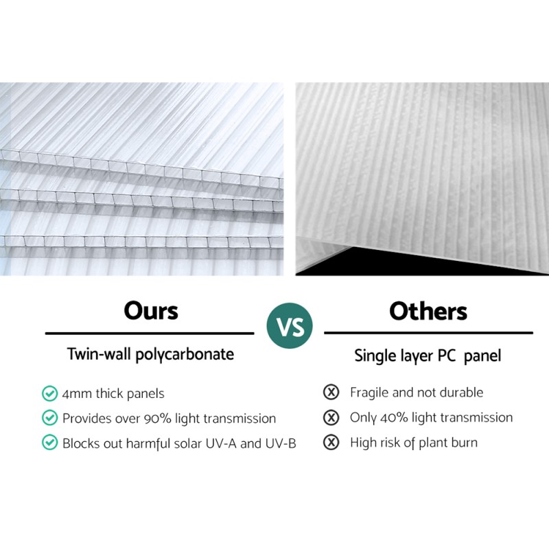 Unleash your green thumb with the Greenfingers Aluminium Greenhouse, designed for avid gardeners. With a spacious 14.72m³ volume, it accommodates a variety of plants and veggies. Its UV-resistant twin-wall polycarbonate panels provide optimal light transmission while preventing plant burn. The robust triangular aluminium frame ensures stability, while adjustable roof vents and an efficient gutter system promote healthy plant growth. Embrace year-round gardening with this durable, easy-to-install greenhouse. Get yours today!