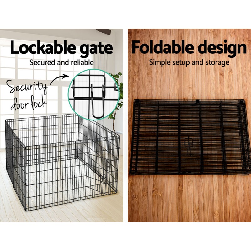 Give your pet the freedom to play safely with the i.Pet 30" 8 Panel Dog Playpen. This versatile enclosure is crafted from durable, powder-coated steel, offering multi-configuration options to suit your pet's needs. Create an octagon or square setup effortlessly, or expand the play area with an additional set. Ideal for both indoor and outdoor use, it features a secure bolt latch, locks, and rounded edges for safety. Perfect for puppies, kittens, guinea pigs, and rabbits, it's easy to fold for storage or travel.