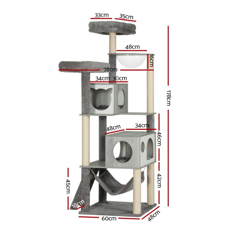 Elevate your feline's playtime with the i.Pet Cat Tree! Standing 178cm tall, this cat tree is designed to fulfil your pet's natural instincts. With a stable base and sturdy wood construction, it offers a variety of activities: scratching natural sisal posts, climbing multi-level designs, and lounging on plush beds. The soft linen cover, detachable bowl, and cosy cubby make it a haven for rest and play. Easy to assemble, It's perfect for keeping your cat feline fine. Comes with a 1-year warranty.