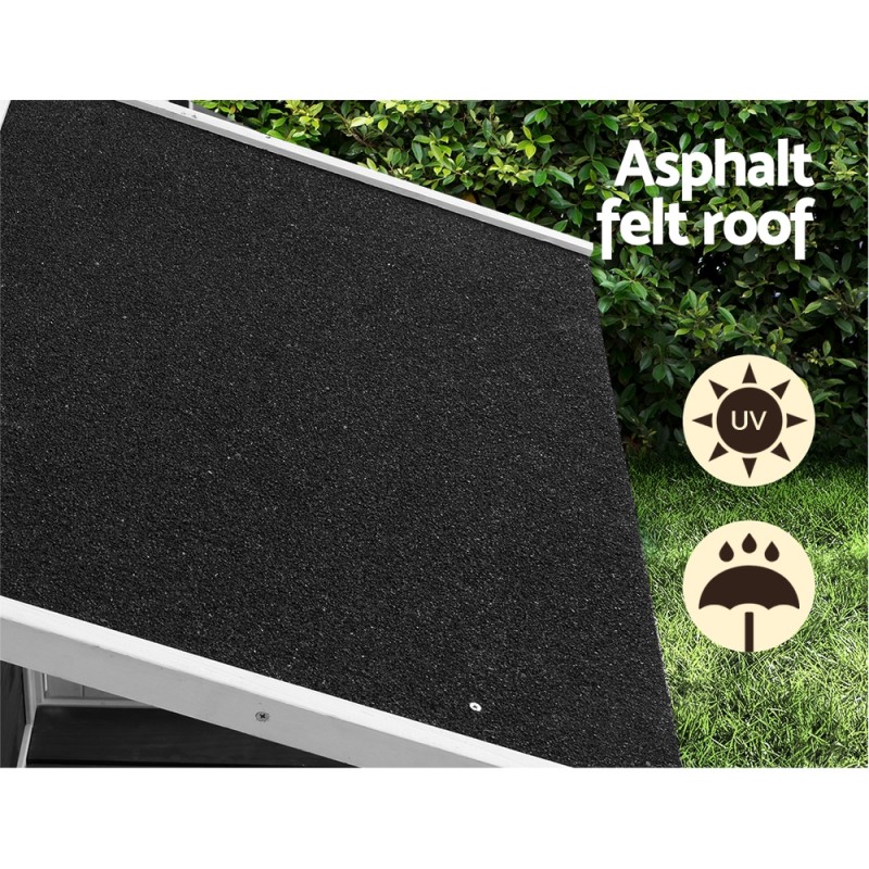 Give your beloved pets a safe and comfortable home with the i.Pet Dog Kennel House. Crafted from solid natural Fir wood with a UV-resistant asphalt roof, this kennel is designed to withstand all weather conditions. Its angled roof and raised floor ensure proper drainage and ventilation, preventing mould and odour. With rubber feet for stability and two entry points for easy access, it's perfect for indoor and outdoor use. Easy to assemble and maintain, this kennel is the ideal haven for your furry friend.