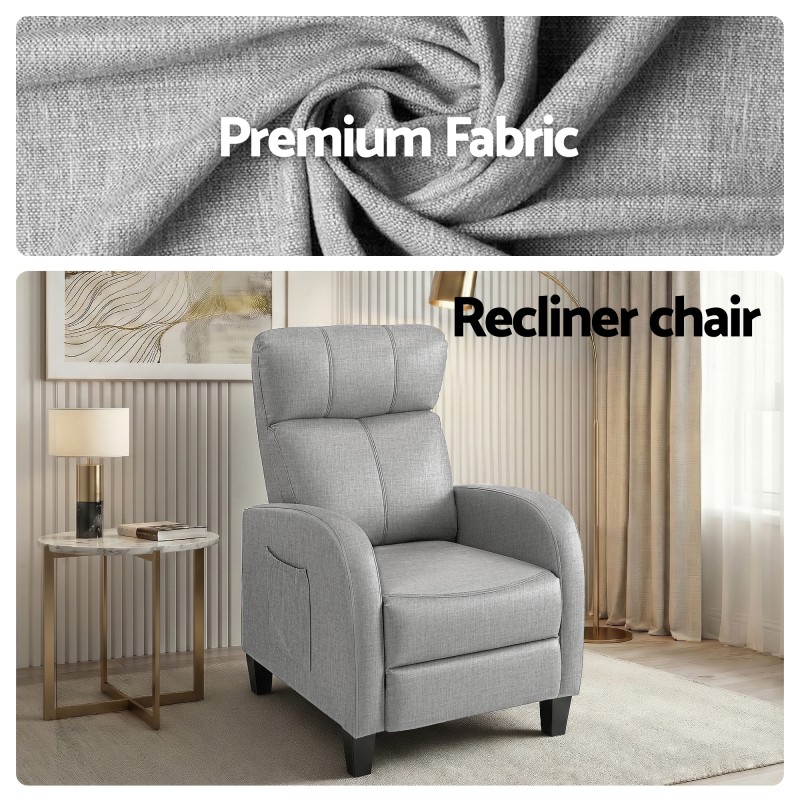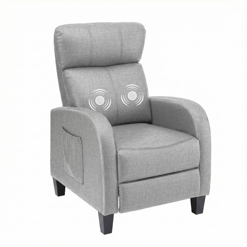 Experience unparalleled relaxation with the Artiss Massage Recliner Chair in elegant grey fabric. This premium recliner offers a 2-point massage system with 8 modes and 3 intensity levels, expertly soothing your lower back. Effortlessly adjust from a 90° reading position to a 150° nap-ready recline with the push-back mechanism. Its plush, padded headrest and armrests deliver full-body comfort, while the waterproof fabric ensures easy maintenance. Built with a solid wood frame, this chair supports up to 150 kg, making it ideal for diverse uses, from a nursery chair to a stylish accent piece.