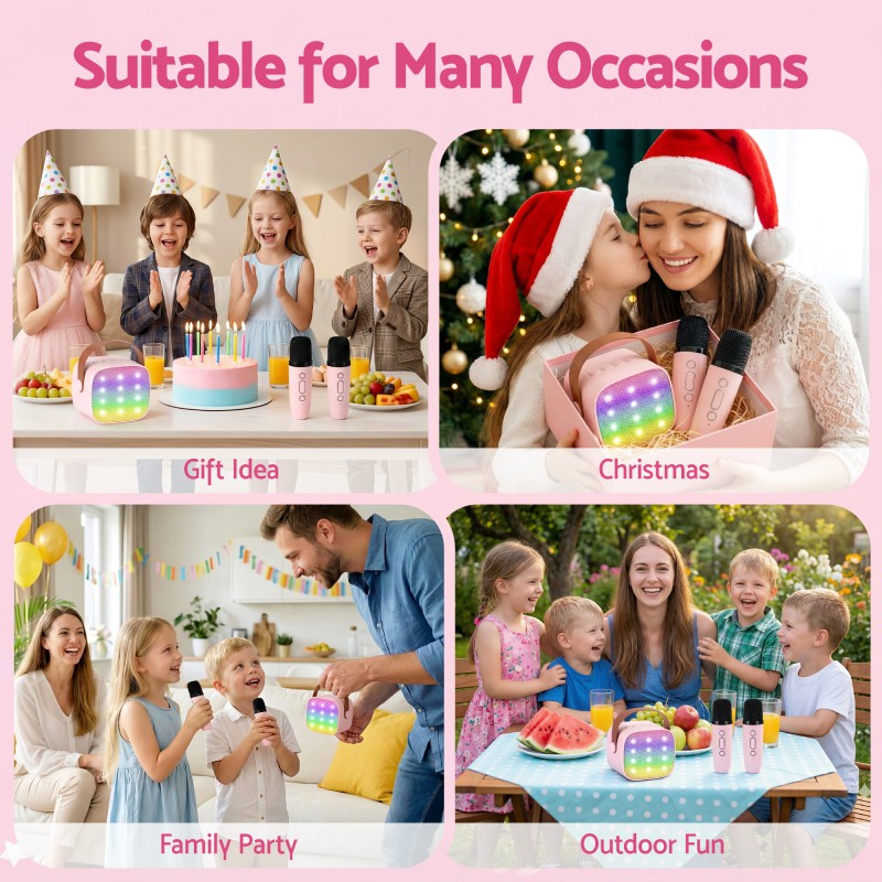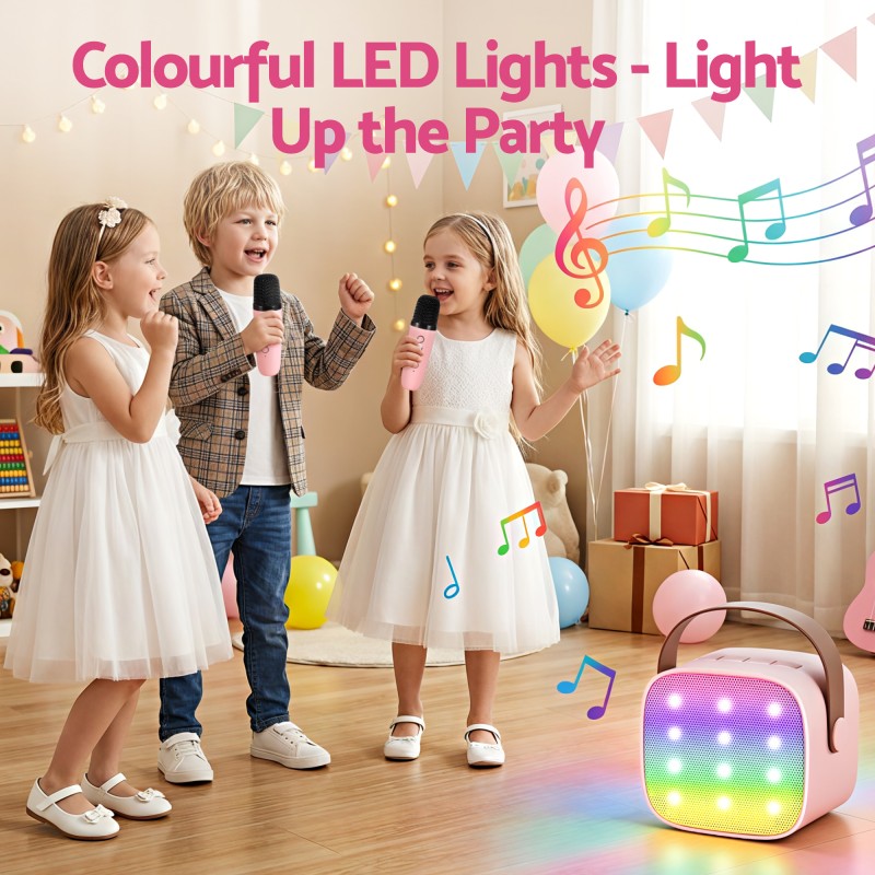 Unleash your inner superstar with the Alpha Mini Portable Karaoke Machine, perfect for both adults and kids! Transform any space into a lively stage with this compact powerhouse featuring high-fidelity sound and dazzling LED light effects. Whether it's a backyard party, family birthday, or a fun night in, our dual wireless microphones ensure everyone can join the fun. Easy to use and transport, it offers professional audio features for an unforgettable musical experience. Connect via Bluetooth, TF card, or headphone jack and enjoy up to 5 hours of non-stop entertainment!