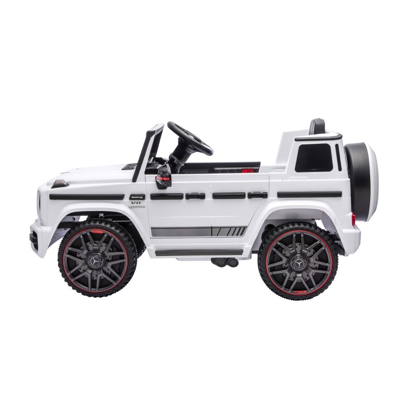 Ignite your child's imagination with the Mercedes-Benz Kids Electric Ride On Car G63 in sleek white. This mini luxury vehicle offers a thrilling and realistic driving experience with a steering wheel, acceleration pedal, and working doors. Safety is prioritised with an adjustable seat belt and a parental remote control for peace of mind. The car features a lacquer finish, keyless start, twin motors, and built-in music for endless fun. Perfect for young car enthusiasts aged 3–4 years, this ride-on car is a dream gift that combines style, safety, and excitement in one exceptional package.