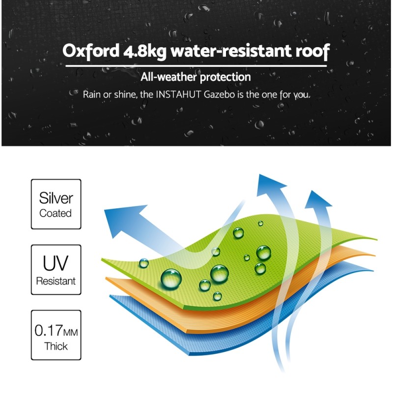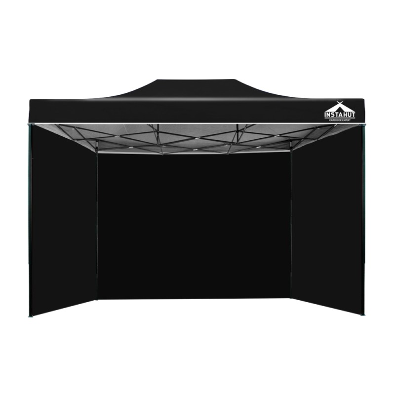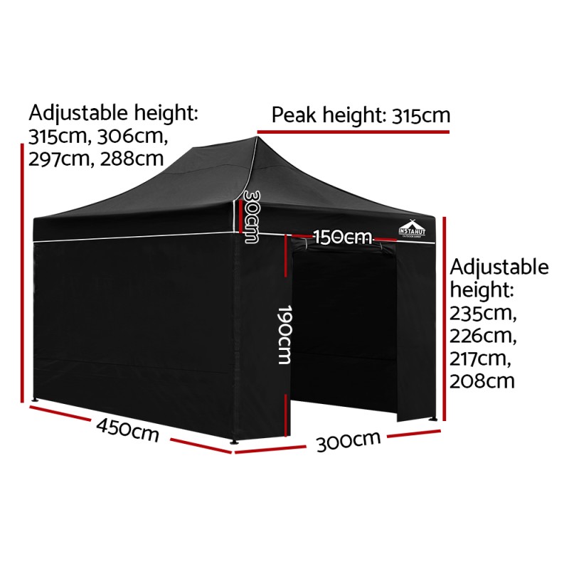The INSTAHUT Gazebo Pop Up Marquee 3x4.5m is your perfect outdoor companion. Featuring durable 500D PU-coated Oxford fabric, this black folding tent provides 300x450cm of UV and water-resistant coverage. With its robust steel frame and quick setup, it’s versatile for markets, events, or backyard gatherings. Enjoy adjustable heights, bonus fly mesh for ventilation, and a roll-up door. Compact and portable, it includes a carry bag, sandbags, and ropes for stability. Not for extreme weather. 1-year warranty.