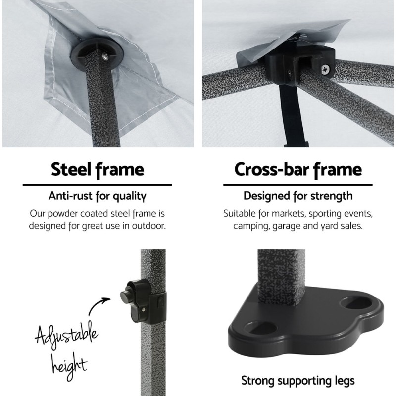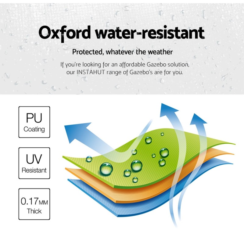 Experience unmatched versatility and protection with the INSTAHUT Gazebo Pop Up 3x4.5m, perfect for any outdoor event. Designed with high-density, long-lasting PU-coated 500D oxford fabric, it's UV and water-resistant, providing ample 450x300cm coverage. The extra-strong, powder-coated steel frame ensures durability, with quick Velcro attachments for easy setup. Featuring three adjustable height levels and a set of 4 base pods for enhanced stability, this gazebo is ideal for markets, sports, camping, and more.