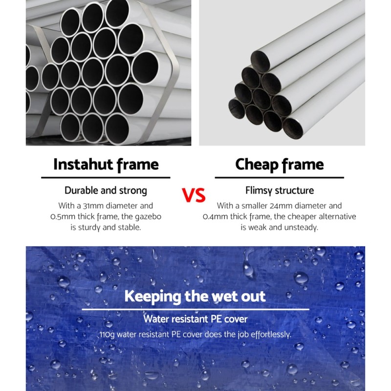 Introducing the Instahut Gazebo 3x9m Marquee, your ultimate companion for outdoor events. Perfect for weddings, parties, sports days, and more, this versatile tent offers 300 x 900cm of UV-resistant and waterproof coverage. Featuring sturdy steel legs, removable panels, and ample ventilation, it ensures comfort and durability. Easily transport and assemble with the bonus carry bag. Note: Not for permanent use or extreme weather.