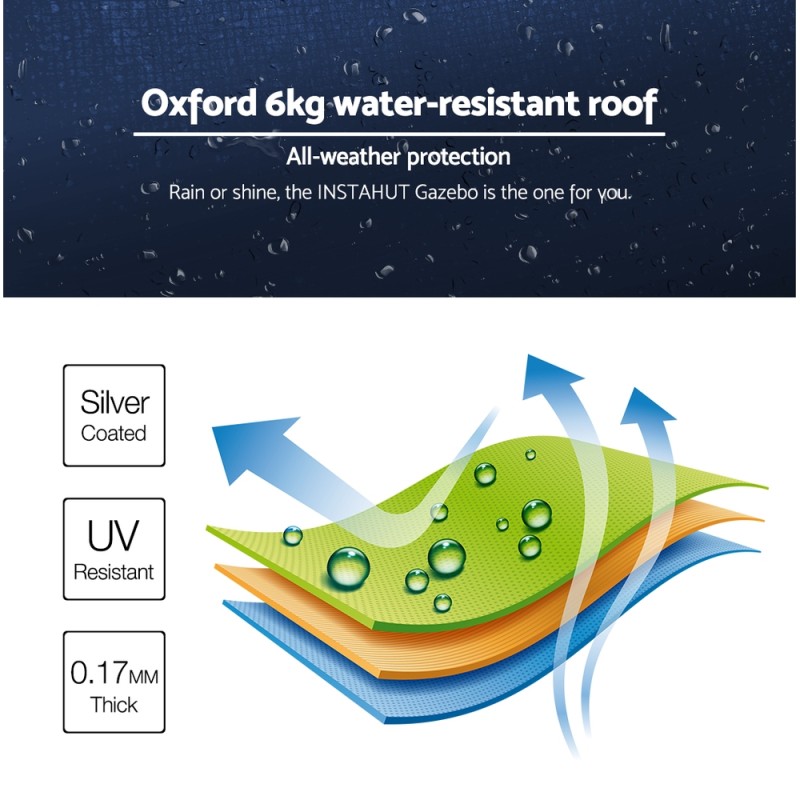 Discover the ultimate in outdoor protection with the INSTAHUT Gazebo Pop-Up Marquee. Perfect for any occasion, this 3x6m foldable tent features durable 500D Oxford fabric with PU coating, offering exceptional UV and water resistance. Its robust steel frame and easy setup promise reliability and convenience. With adjustable heights, side walls, and added fly mesh, it ensures comfort and versatility. Ideal for markets, events, and camping, this gazebo is your go-to for quality and affordability, backed by a 1-year warranty.
