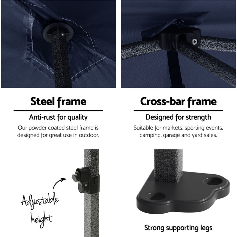 The INSTAHUT Gazebo Pop Up 3x3m with Base Pods is your perfect outdoor companion for events, providing reliable shade and shelter. Crafted from durable 500D Oxford fabric with a high-density PU coating, this navy canopy is UV and water resistant. Its robust steel frame and quick setup features make it a must-have for any occasion. With adjustable height levels and included base pods for added stability, it's ideal for markets, weddings, camping, and more. Enjoy effortless assembly and peace of mind with a 1-year warranty.