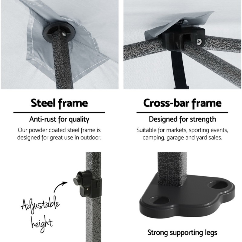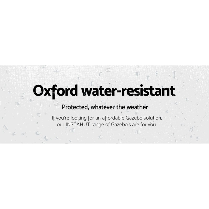 Introducing the INSTAHUT 3x3 Pop Up Gazebo, your ultimate outdoor companion. Crafted from durable 500D Oxford fabric with PU coating, it offers 300x300cm of UV and water-resistant coverage. Its robust steel frame ensures stability, while quick Velcro attachments and a nylon glide system simplify setup. With three adjustable heights and included accessories, it's perfect for events, camping, and more. Not for permanent use or extreme weather. Includes a 1-year warranty for peace of mind.