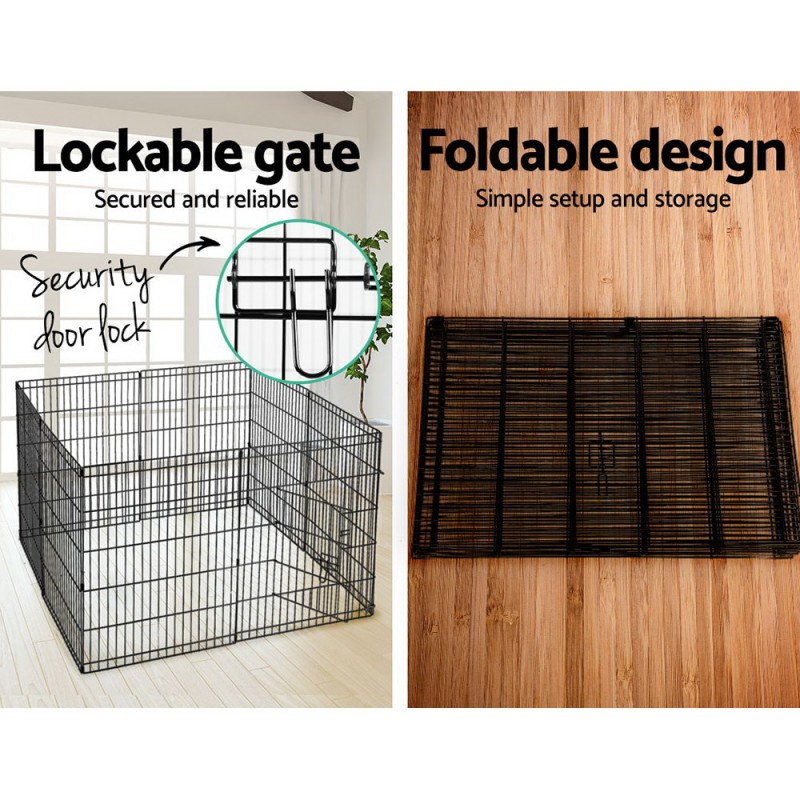Introduce your pet to safe play with the i.Pet 2x30" 8 Panel Dog Playpen. Crafted from durable powder-coated steel, this versatile enclosure offers multiple configurations, including octagon and square shapes. Expand the play area by joining two sets. Ideal for indoor and outdoor use, it features secure bolt latches, round edges, and a foldable design for easy storage and transport. Perfect for puppies, kittens, guinea pigs, and rabbits, this playpen ensures fun and safety for your beloved pets.