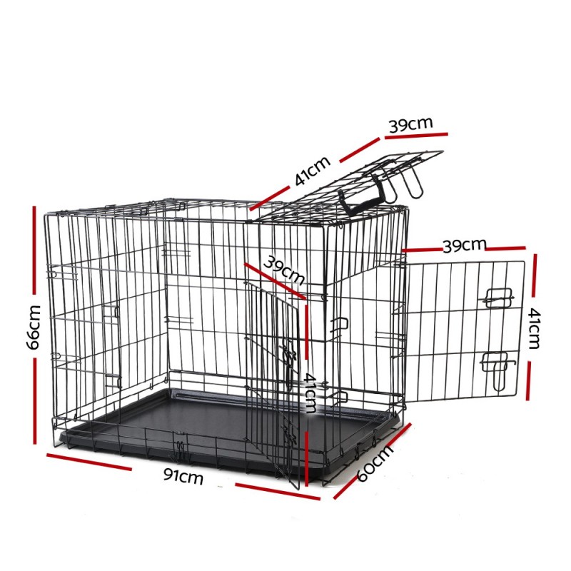 The i.Pet 36" Dog Cage Crate Kennel makes pet transport and care effortless. Designed for medium-sized pets, it features triple access doors for easy entry, a slide-out tray for hassle-free cleaning, and a sturdy, rust-resistant black powder-coated metal frame. This foldable cage assembles without tools and folds neatly for storage or travel. Ensure your pet's comfort and safety with the i.Pet Dog Cage, backed by a 1-year warranty.