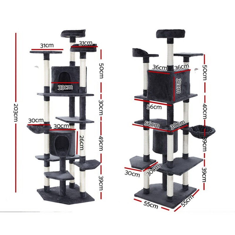 Introducing the i.Pet Cat Tree 203cm Tower, your feline's ultimate playground! Designed to mimic a natural habitat, it's packed with engaging features for scratching, climbing, and lounging. The multi-level design includes plush cradles, hammocks, and a playful hanging mouse. With sisal-covered posts, protect your furniture while providing a stable haven for your pet. Crafted with a sturdy wooden base, this cat tree ensures durability and endless fun. Experience peace of mind with a 1-year warranty.