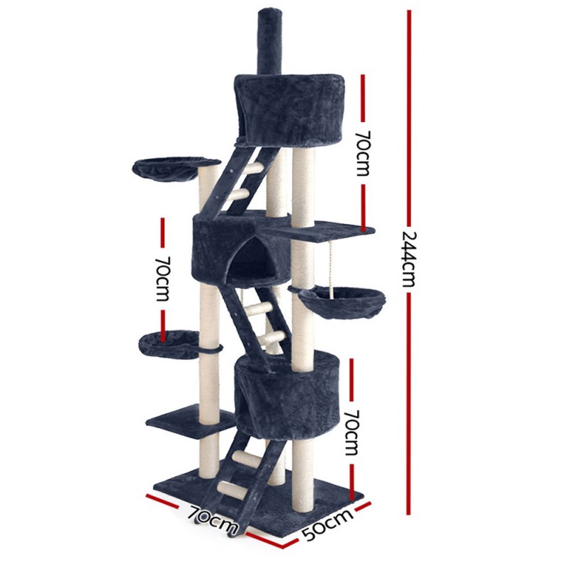 Transform your home into a feline paradise with the i.Pet Cat Tree 244cm in Grey. This towering wonderland caters to your cat's every whim, featuring multiple levels of play areas, cosy hammocks, and plush cradles. Crafted from durable particleboard and wrapped in soft plush velvet, it offers stability and comfort. Natural sisal posts provide the perfect scratching surface, protecting your furniture. Assemble with ease and enjoy a 1-year warranty for peace of mind. Your cat will purr with delight!